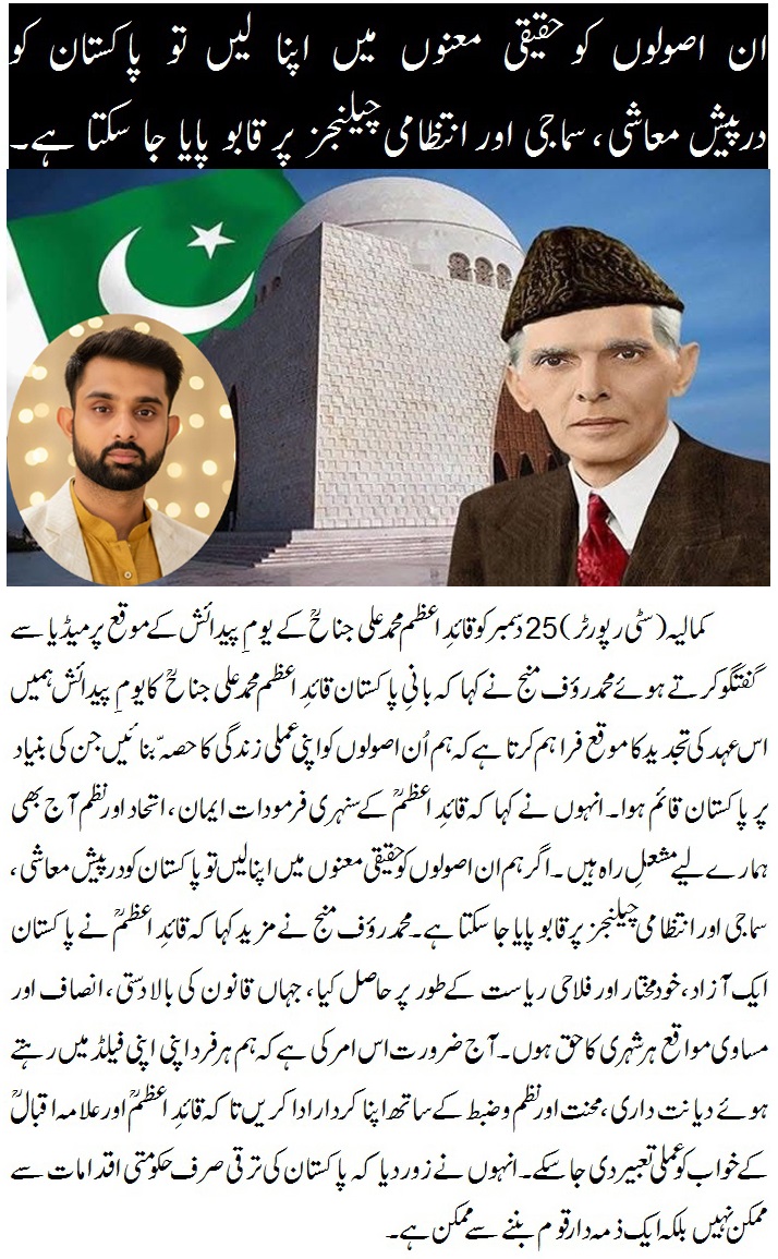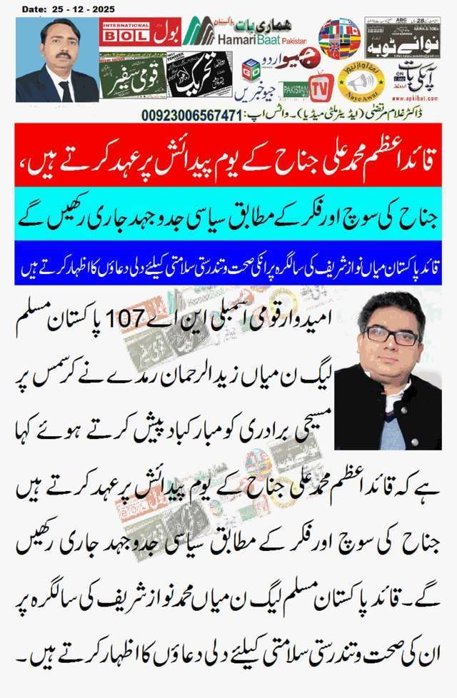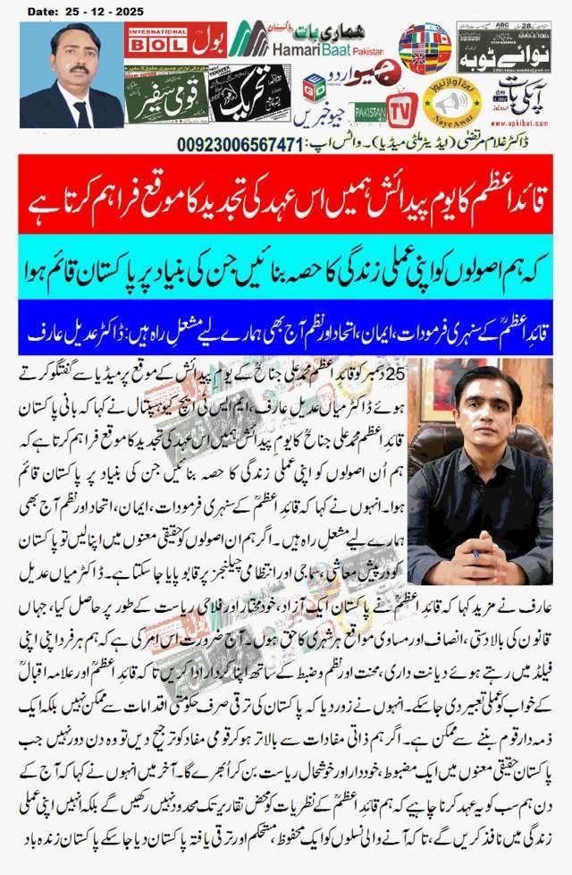 قائدِ اعظمؒ کے سنہری فرمودات ایمان، اتحاد اور نظم آج بھی ہمارے لیے مشعلِ راہ ہیں۔ محمد رؤف منج Dr.Ghulam Murtaza دسمبر 26, 2025 Home, اہم خبریں, پاکستان, پنجاب, صفحہ اول, فخر پاکستان Leave a comment 8 Views Share Facebook Twitter Google + LinkedIn Pinterest