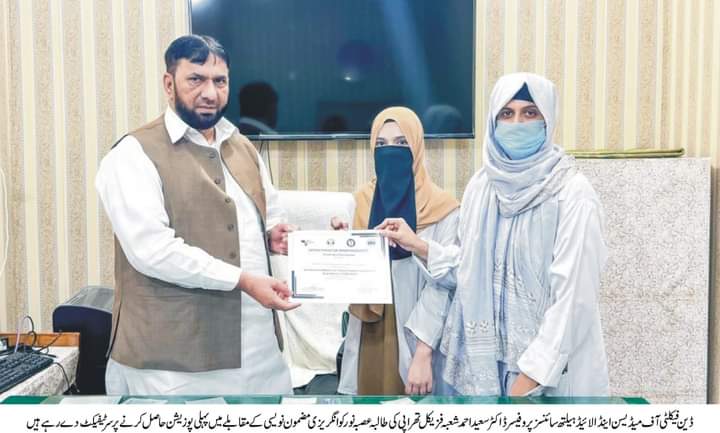 اسلامیہ یونیورسٹی بہاولپور کی طالبہ عصبہ نور کی انگریزی مضمون نویسی کے مقابلے میں پہلی پوزیشن