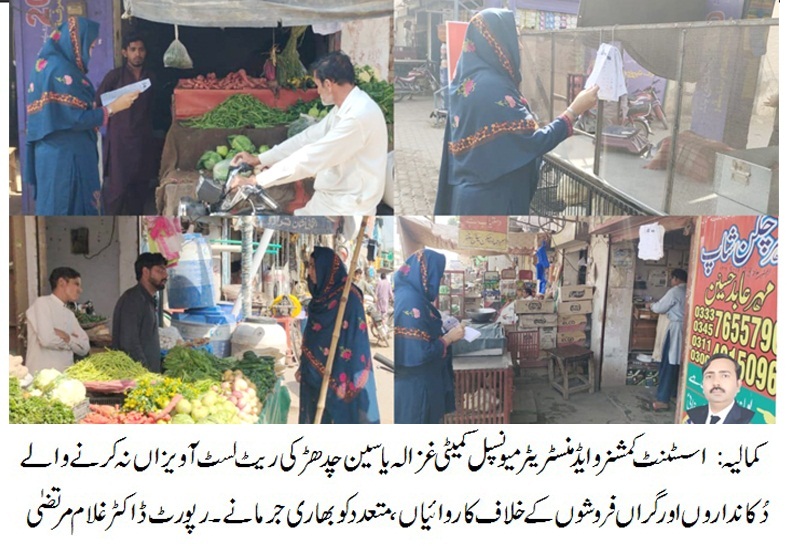 کمالیہ : اسسٹنٹ کمشنر و ایڈمنسٹریٹر میونسپل کمیٹی غزالہ یاسین چدھڑ کی ریٹ لسٹ آویزاں نہ کرنے والے دُکانداروں اور گراں فروشوں کے خلاف کاروائیاں، متعدد کو بھاری جرمانے