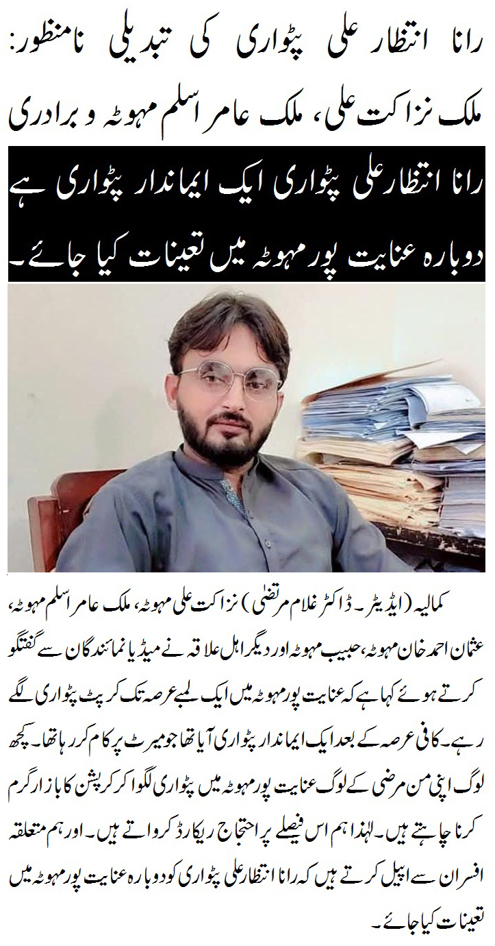 رانا انتظار علی پٹواری کی تبدیلی نامنظور ، رانا انتظار علی پٹواری کو دوبارہ عنایت پور مہوٹہ میں تعینات کیا جائے۔