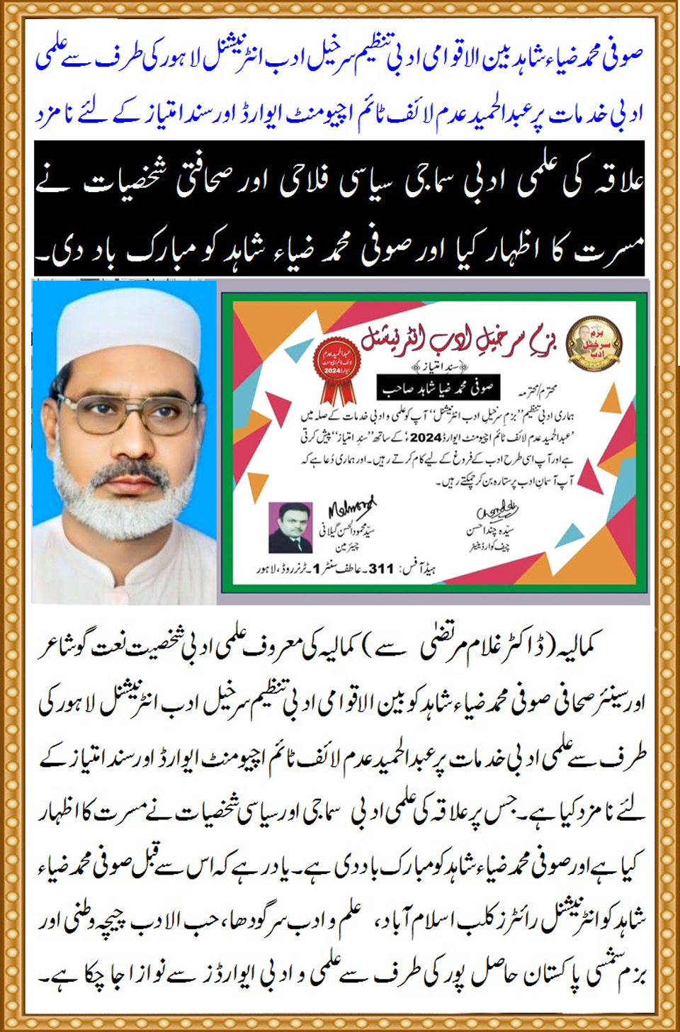Home / Home / صوفی محمد ضیاء شاہد کو بین الاقوامی ادبی تنظیم سرخیل ادب انٹرنیشنل لاھور کی طرف سے علمی ادبی خدمات پر عبدالحمید عدم لائف ٹائم اچیومنٹ ایوارڈ اور سند امتیاز کے لئے نامزد کر دیا گیا